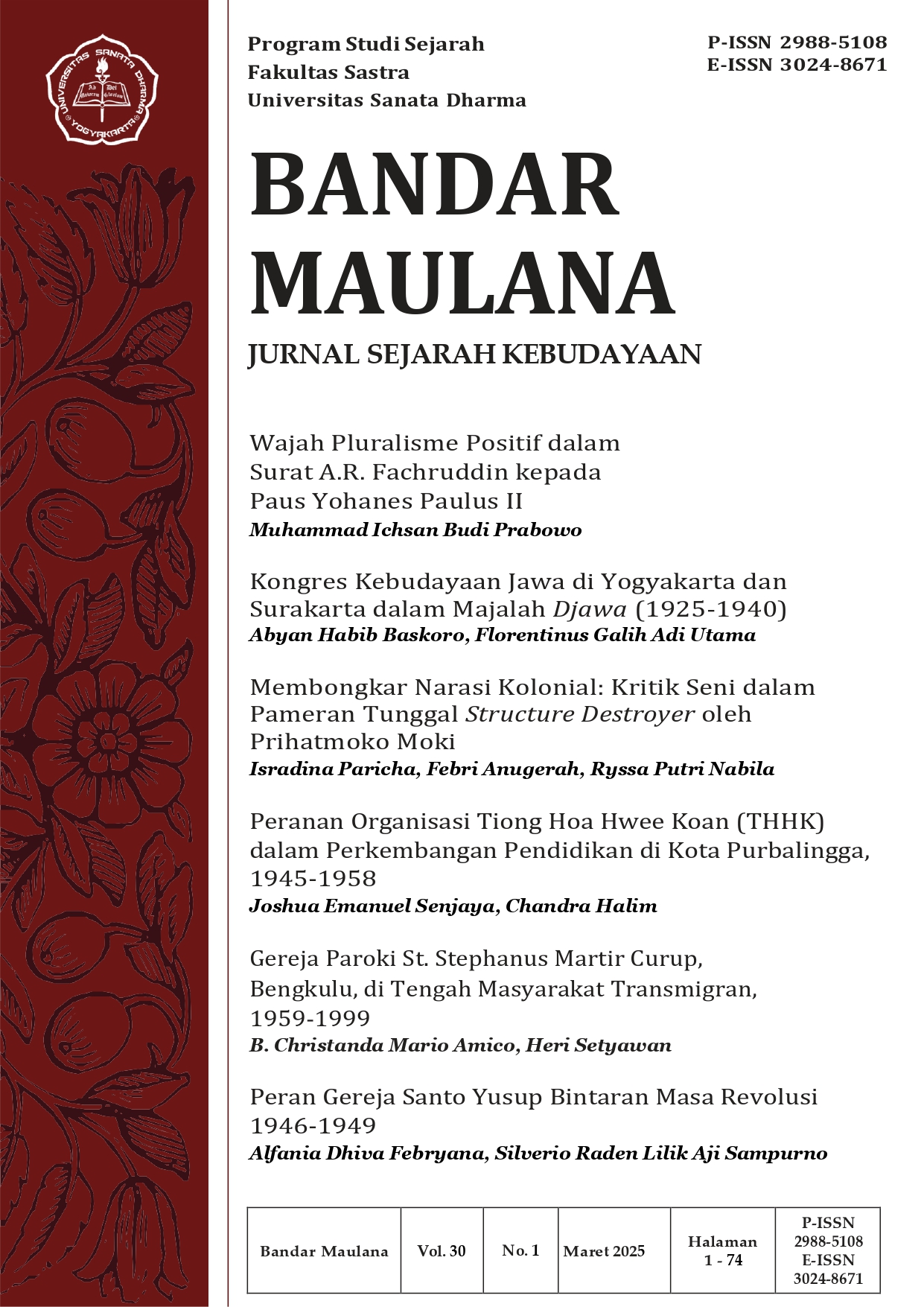 Journal Title : Bandar Maulana: Jurnal Sejarah Kebudayaan Frequency : 2 issues per year | March and October DOI : https://doi.org/10.24071/jbm ISSN : 3024-8671 (Online) | 2988-5108 (Print) Editor in Chief : Florentinus Galih Adi Utama Publisher : Prodi Sejarah, Fakultas Sastra, Universitas Sanata Dharma Indexing : Google Scholar  -