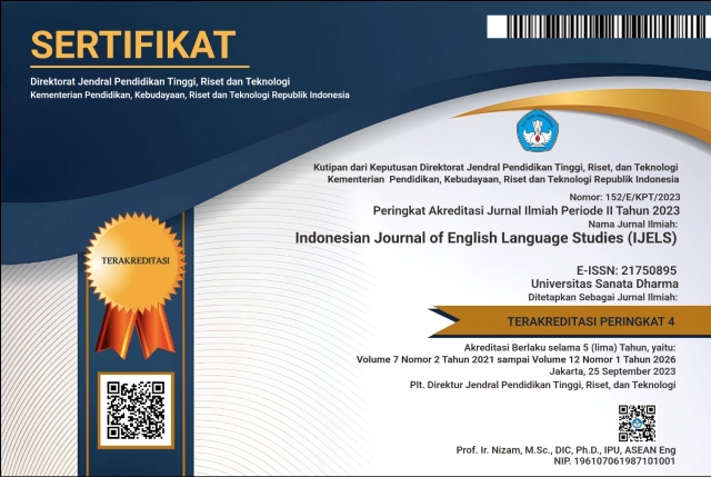We would like to inform you that Indonesian Journal of English Language Studies (IJELS) has been nationally accredited Sinta 4 by the Ministry of Education, Culture, Research and Technology of the Republic of Indonesia based on the decree No. Surat Keputusan 152/E/KPT/2023. Validity for 5 years: Vol 7 No 2, 2021 till Vol 12 No 1, 2026